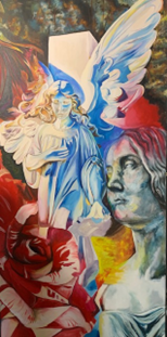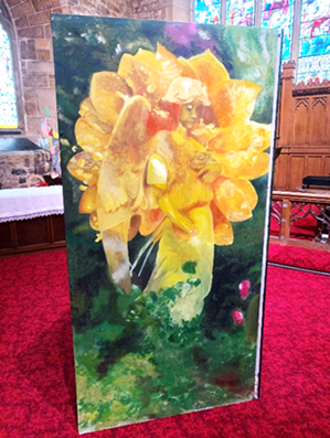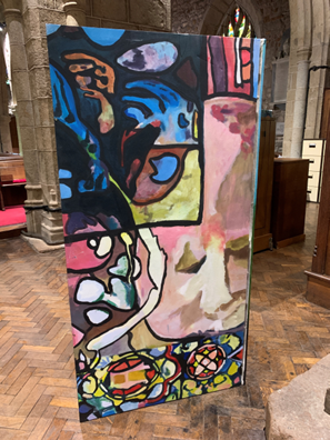 The students kept visual journals throughout this time and used what they created and learned to produce a series of images that reflected their investigation. These 6 foot by 3 foot acrylic paintings on canvas are the result of this investigation. They echo the colours and forms seen in and around the church such as the Lily Langtry sculpture which is used by a few of the students, or the black lead framing of the stained-glass windows. They also give a sense of what young people think about and find important in their lives beyond the material or social.